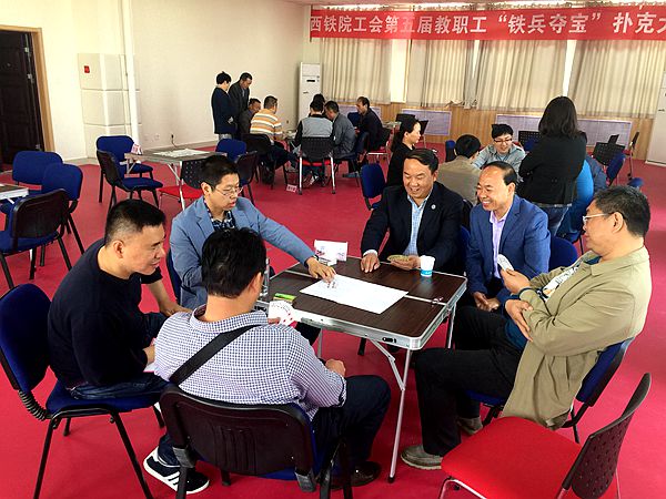 4月27日下午乘借着我院第六十届运动会召开的东风,院工会在新落成的学院职工活动室(港务校区电气工程学院8楼),举办了我院第五届教职工“铁兵夺宝” 牌艺团体暨个人大赛,院工会副主席同颖葵致开幕词并宣布比赛开始。