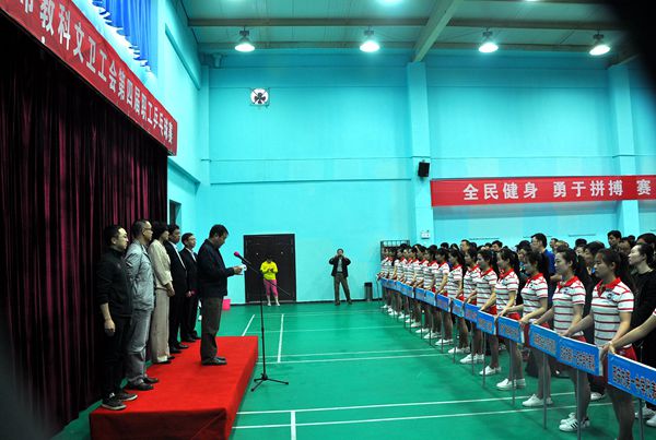 大赛开幕式由我院工会副主席同颖葵主持,学院党委副书记康敬远代表学院致欢迎词,大赛组委会副主任、市总工会教科文卫体工会干事戴超致开幕词,我院职工尚希光和莲湖教育工会职工来水分别代表全体裁判员和运动员宣誓,市总工会副主席魏大宝珠宣布比赛开始。