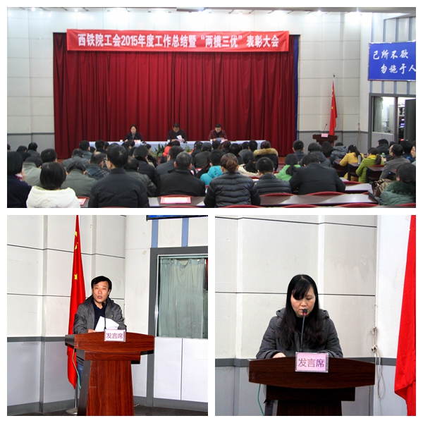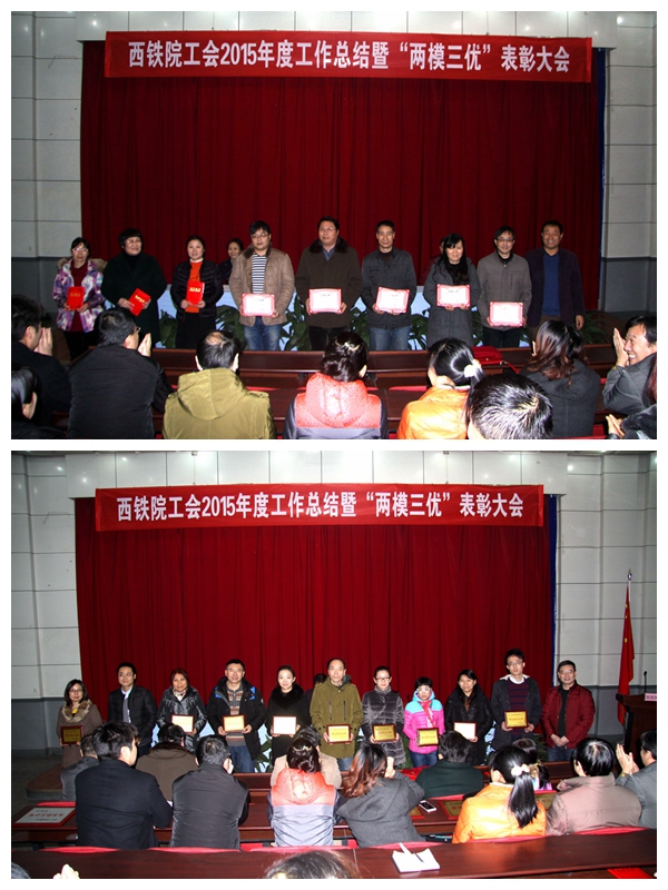 元月7日下午,院工会在阶梯教室召开了2015年度工作总结暨“两模三优”表彰大会。党委副书记康敬远出席了大会并宣读《西铁院工会2015年度“两模三优”表彰决定》和《西铁院文明公民表彰决定》,为获得表彰的西铁院文明公民和集体颁奖。临潼校区分会主席吴西蒙和干部科科长